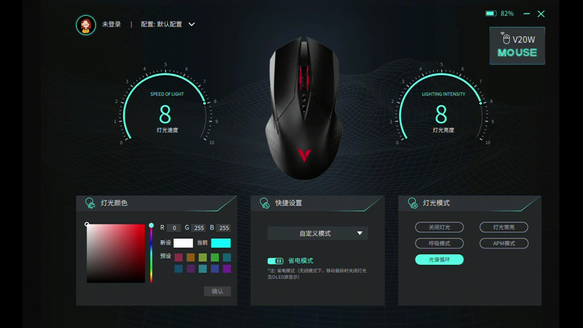 灯光部分,雷柏V20W三区1680万色背光灯,前面已经提到过,在软件驱动内有5种灯光预设,也可以自定义色彩、灯光亮度和速度。还有个小细节,软件中鼠标渲染图和鼠标本体RGB同步变化。
