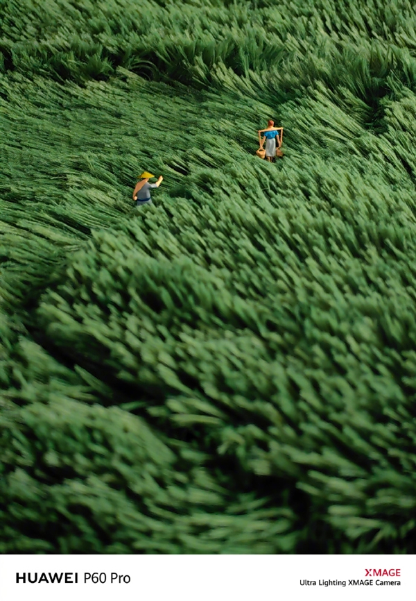 此次放出的四张样张,乍看之下似乎都不过是普通的农家田园风景照,但仔细观察却能够发现,这些“农民”耕作的“田地”,其实是微距镜头下的毛衣的毛线纹路;而随风弯曲的大片翠绿也不是什么农作物,也只是在平常不过的绿色毛巾。