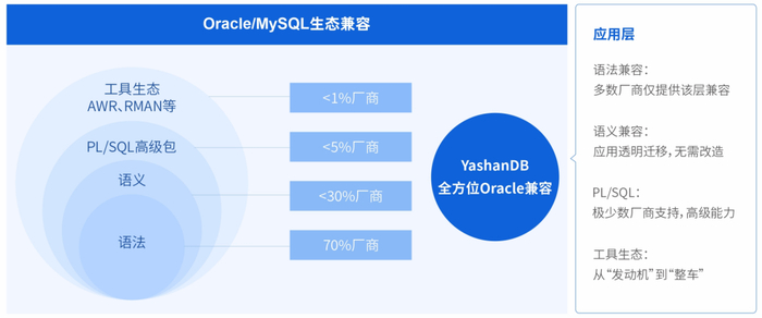 首先,YashanDB 提供对Oracle生态的全面兼容,应用无需大量改造,用户能够以极小的成本和代价完成迁移,支持存量系统在语法、语义、PL/SQL等高级功能的完整兼容能力。在某央企集团国产化替代实践中,涉及近8000张表、9000个索引、1000个视图,400个函数和600个存储过程共计30万以上行代码,能做到99%以上的兼容程度,实现平滑迁移。