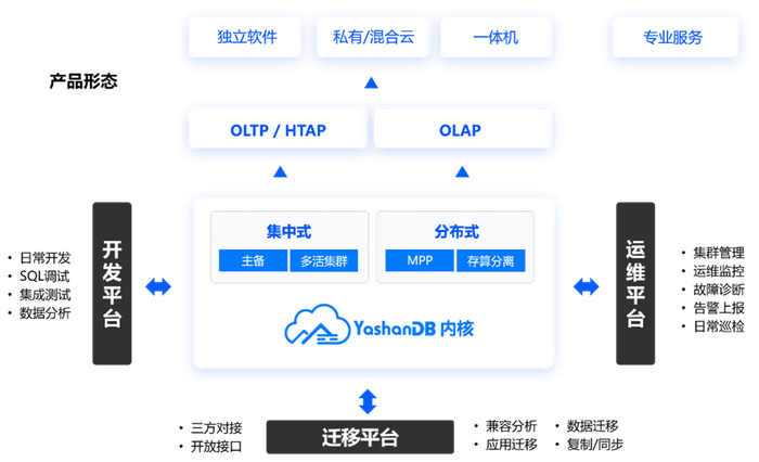 在一个内核引擎基础之上,YashanDB支持单机/主备、共享集群、分布式等多种部署方式,覆盖OLTP/OLAP/HTAP交易和分析混合负载的场景,提供独立软件/云/一体机/咨询/运维等多形态服务。同时围绕数据全生命周期管理,YashanDB提供三大工具平台——开发平台、运维平台及迁移平台。