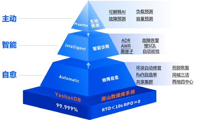 第一层是做到“automatic”故障自愈。采用主备复制、同城双活、三地五中心等高可用技术,极大地提高系统容灾能力;通过死锁检测与修复、数据自动修复、误操作闪回能力等提高系统的容错性,有效满足金融等高端核心业务系统的要求。第二层做到“intelligent”智能诊断, YashanDB提供黑匣子、AWR、ADR等工具帮助用户快速智能地定位问题,缩短停机时间。