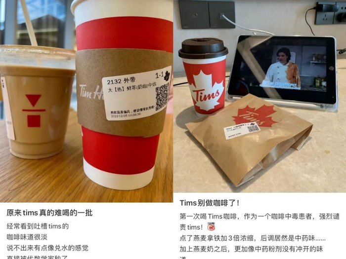 在小红书和微博等社交媒体平台,“小红杯”的讨论热度远不及“小蓝杯”瑞幸和“小绿杯”星巴克,比如小红书上相关笔记,瑞幸和星巴克均在百万篇左右,而关于Tims咖啡的评价,则更多是“不好喝”,其中不乏网友表示“为了点他们家贝果才点了咖啡,结果难喝晕了”、“这辈子没有喝过这么难喝的咖啡”、“Tims别做咖啡了,以后就考虑开贝果店吧”、“贝果你可以永远相信Tims家的,他家的咖啡就不要去踩雷了”……