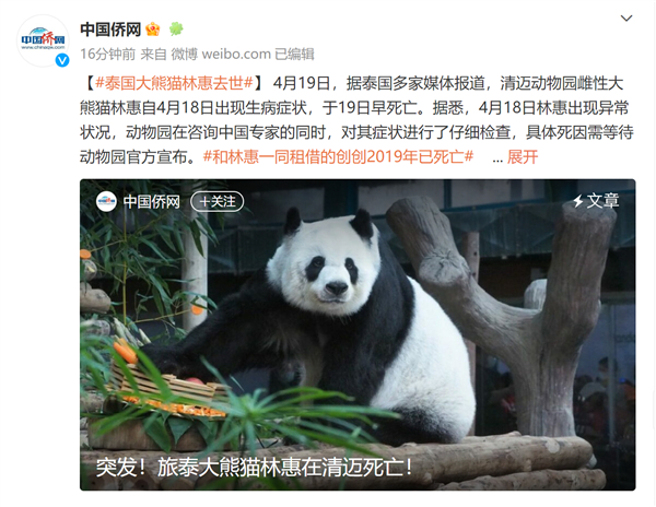 突然!旅泰大熊猫林惠死亡:昨天直播时就已出血 国内网友急了