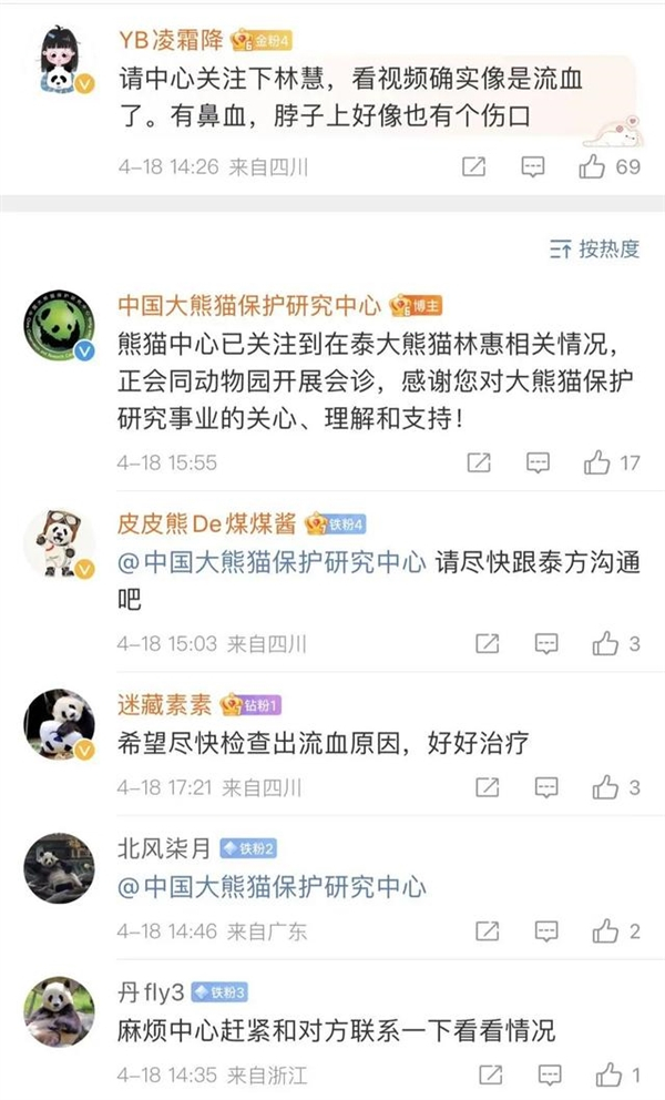 4月18日,一名泰国网友在清迈动物园进行直播时,突然发现旅泰大熊猫林惠突然出现身体不适,鼻部出血、颈部有血迹,精神状态不佳。
