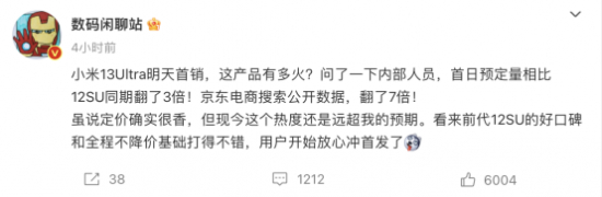 强大的影像表现让小米13 Ultra的预售表现非常亮眼,业界知名数码博主爆料,小米13 Ultra首日预订量较上代同比翻3倍,京东平台电商搜索数据增长700%。