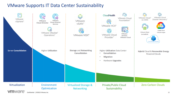 1、私有云领域。 VMware 利用虚拟化的技术,帮助客户削减他们能源的消耗量。总计在过去二十多年中,VMware 帮助客户削减了大概12亿顿的碳排放,它约等于25亿兆瓦的能源消耗量。在帮助企业实现碳中和的过程中,迁移的成本问题是一个重要且复杂的问题。为降低迁移成本,VMware 和合作伙伴共同打造的零碳承诺计划,既可以极大帮客户降低最低化,就是整个迁移的成本,同时又实现了零碳的目标。