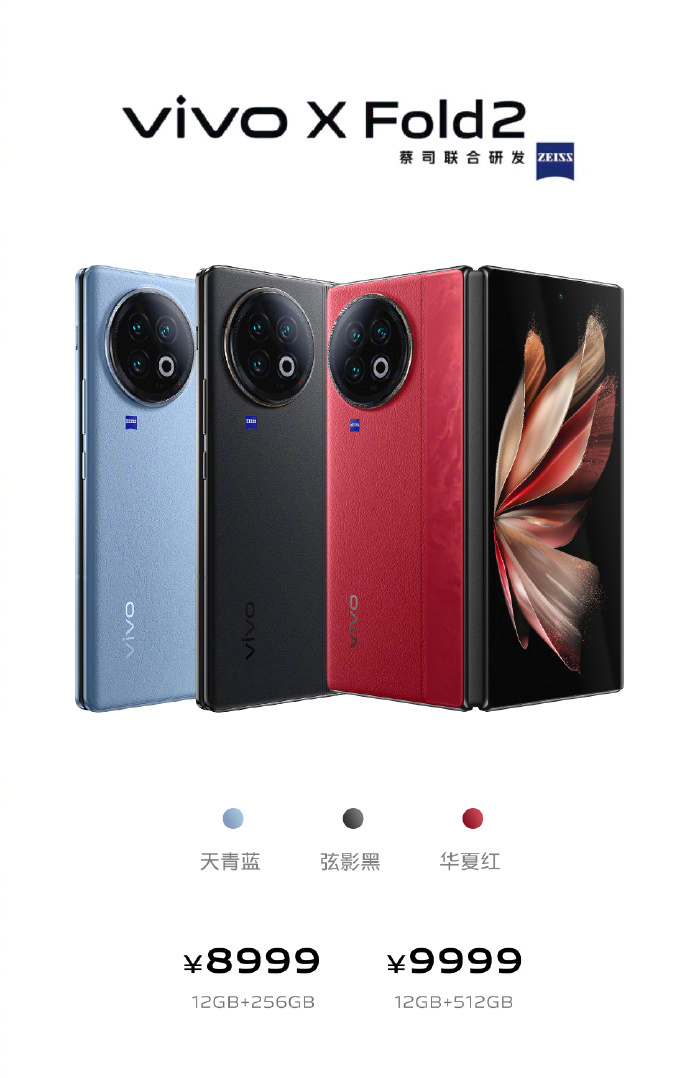 vivo X Fold 2拥有华夏红、天青蓝、弦影黑 3 款配色,12+256GB 版本 8999 元,12+512GB 版本 9999 元。
