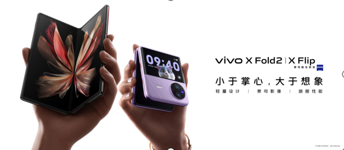 2023年4月20日,在vivo折叠系列及平板旗舰新品发布会上,vivo推出了新一代大折叠vivo X Fold2和首款小折叠vivo X Flip, 带来了“一样好,又好不一样”的折叠旗舰。