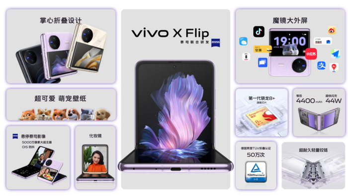 vivo X Flip以小巧的外观、好玩又好用的魔镜大外屏、悬停蔡司影像、超耐久轻量铰链、旗舰级芯片和屏幕配置,真正做到了拉齐直板旗舰配置,超越直板旗舰体验,成为“有颜有实力”、让人一眼就心动的最强小折叠。