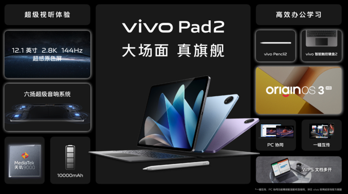 除此以外,vivo还发布了新一代的旗舰平板vivo Pad2,搭载定制的12.1英寸、2.8K、144Hz超感原色屏,天玑9000旗舰芯片,自研六扬超级音响系统,10000mAh超大电池,以及全新的vivo Pencil2和vivo智能触控键盘2等全线旗舰配置,全面释放出“大屏真旗舰”的产品性能。
