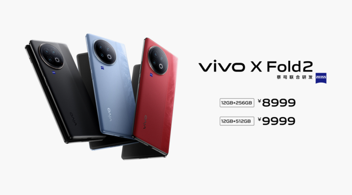 价格方面,本次发布的vivo X Fold2提供了12GB+256GB和12GB+512GB两种配置,售价分别为8999元和9999元。