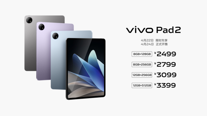 vivo Pad2带来了8GB+128GB、8GB+256GB、12GB+256GB、12GB+512GB四种配置,售价分别为2499元、2799元、3099元、3399元。