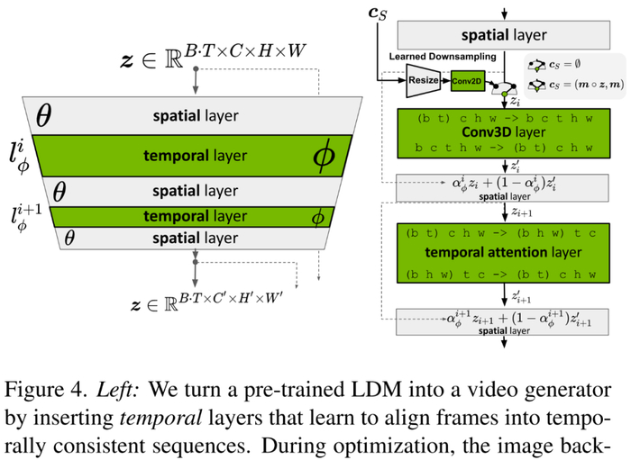 接着将时间维度引入潜在空间 DM、并在编码图像序列(即视频)上仅训练这些时间层的同时固定预训练空间层,从而将 LDM 图像生成器转换为视频生成器(下图左)。最后以类似方式微调 LDM 的解码器以实现像素空间中的时间一致性(下图右)。