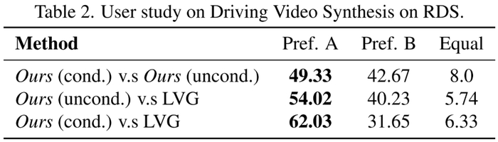 研究者在 RDS 数据集上训练 Video LDM pipeline,包括一个 4 倍像素空间视频上采样器。下表 1 显示了无上采样器时,128×256 分辨率下 Video LDM 的主要结果。研究者展示了有和无拥挤和白天 / 夜晚条件下其模型的性能。可以看到,Video LDM 通常优于 LVG,并且在一定条件下进一步降低了 FVD。