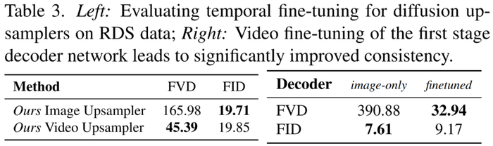 研究者将其视频微调像素空间上采样器与独立逐帧图像上采样做了比较,并使用了 128 × 256 30 fps 的真值视频进行调节,如下表 3 所示。