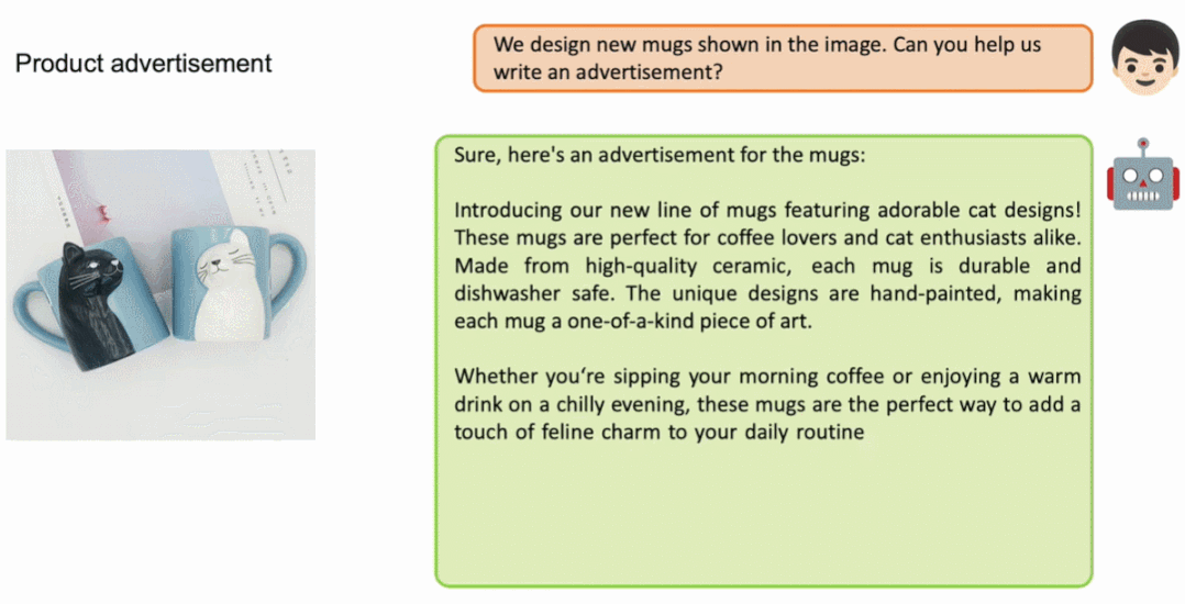 借助 MiniGPT-4,给图片写广告语也变得非常简单。要求 MiniGPT-4 给左边的杯子写广告文案。MiniGPT-4 精准的指出了杯子上有嗜睡猫图案,非常适合咖啡爱好者以及猫爱好者使用,还指出了杯子的材质等等: