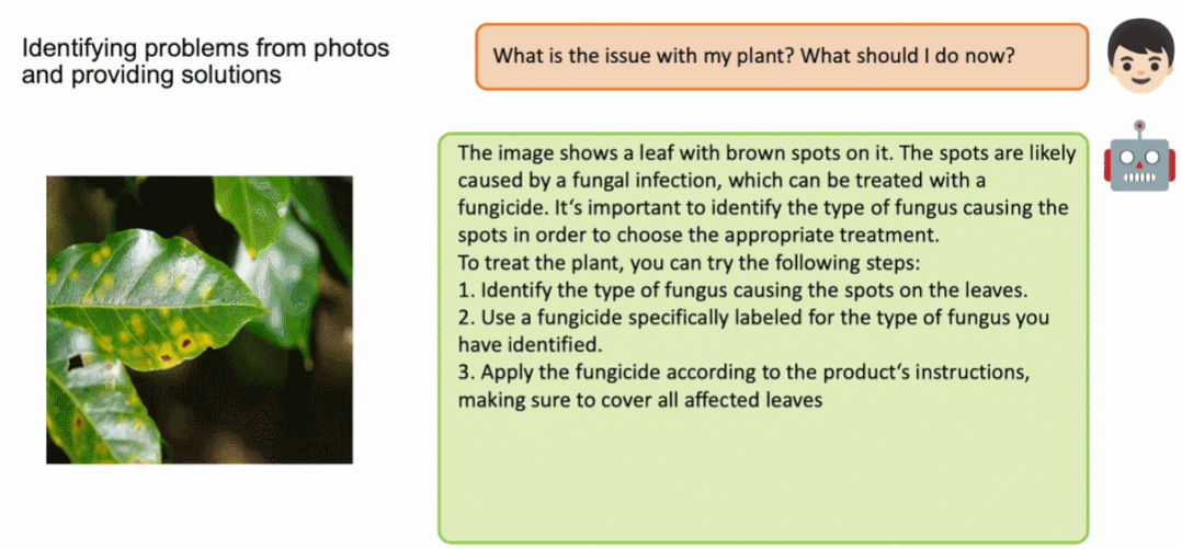 接着,在来看看 MiniGPT-4 图片问答能力。问:「这棵植物出现了什么问题?我该怎么办?」MiniGPT-4 不但指出了问题所在,表示带有棕色斑点的树叶可能由真菌感染引起,并给出了治疗步骤: