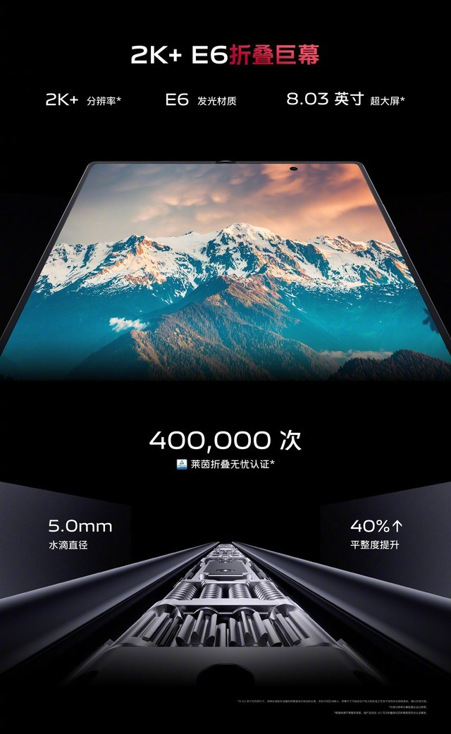 首先在耐用性方面,得益于锆合金液态金属等六重航空材料的应用,vivo X Fold2的铰链耐用性得以大幅度提升。经莱茵测试,vivo X Fold2在经受40万次折叠后,折痕依旧控制的极好,这意味着即使用户每天折叠80次,可使用10年以上,足够一般消费者换机周期内使用无忧。
