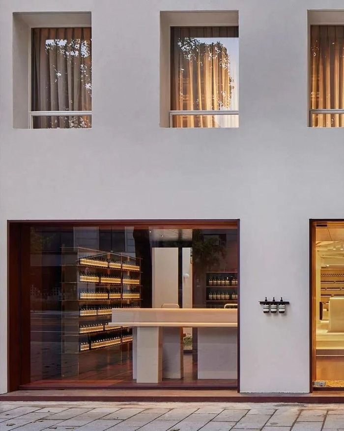 以Aesop国内首店为例,品牌选址上海徐汇区东平路,从周边建筑以及这片区域的地理、文化和历史中不断吸取灵感,打造了一幢复古红砖洋房独栋建筑,营造温馨惬意的生活美学空间。