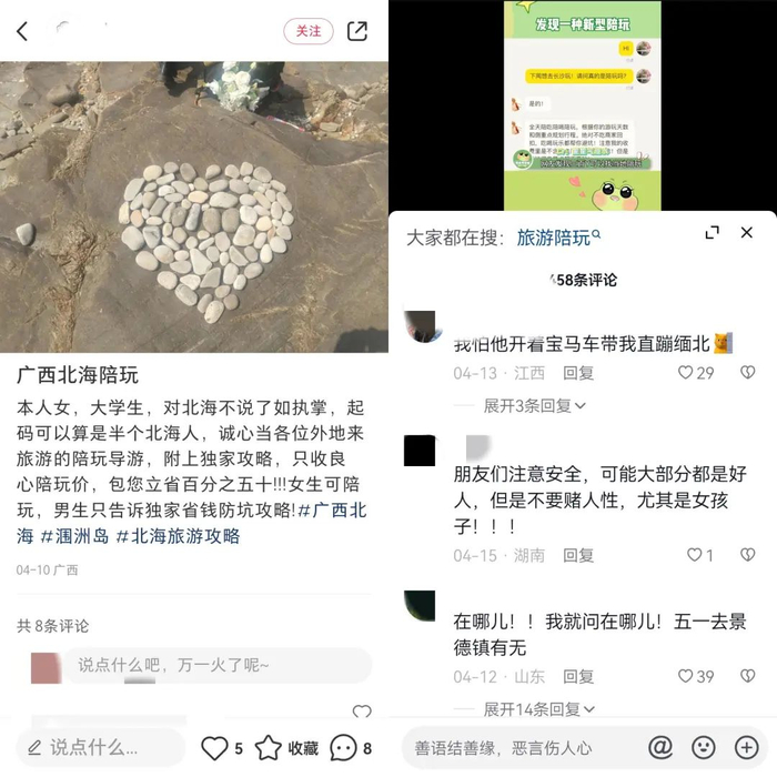 柳州的小阳在小红书发布了相关陪玩笔记后一共接了十几单;苏州的auce在闲鱼刚发布陪玩帖不到十分钟就成交了一单;重庆的呆呆4月刚发布信息就获得了七八个私信询问,“如果不是因为平时要上课,我这边还能接更多的单子,有些单子接不了,我就免费给她们做了旅游攻略”。
