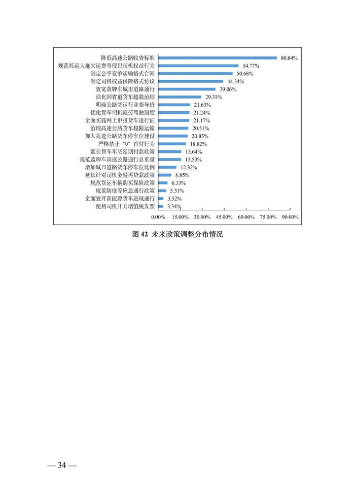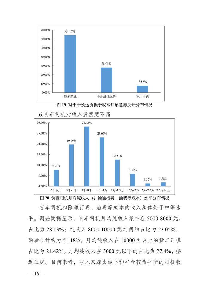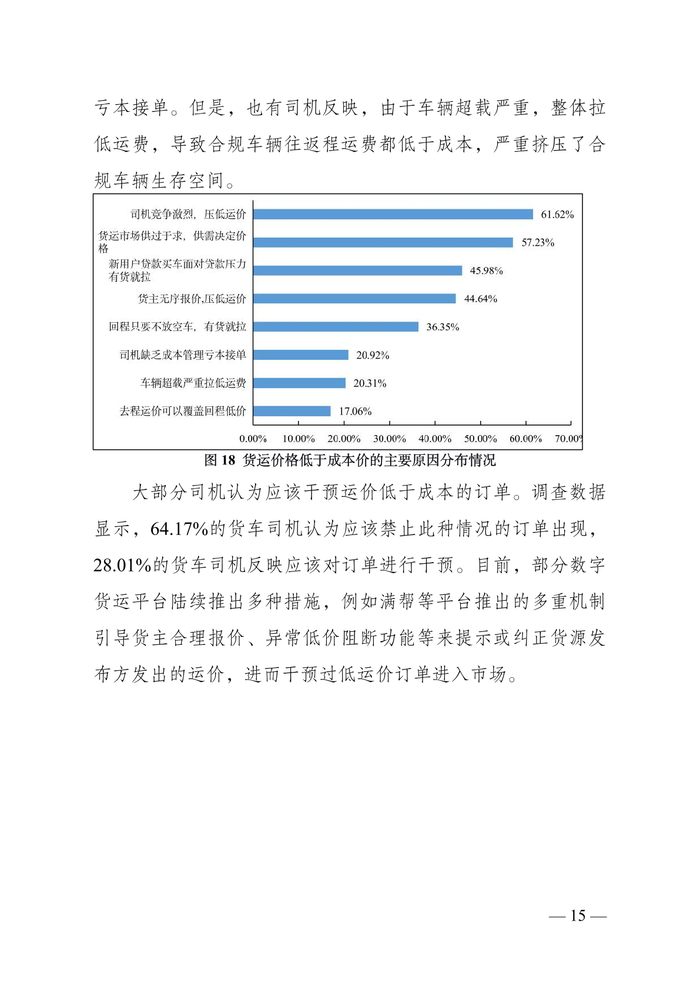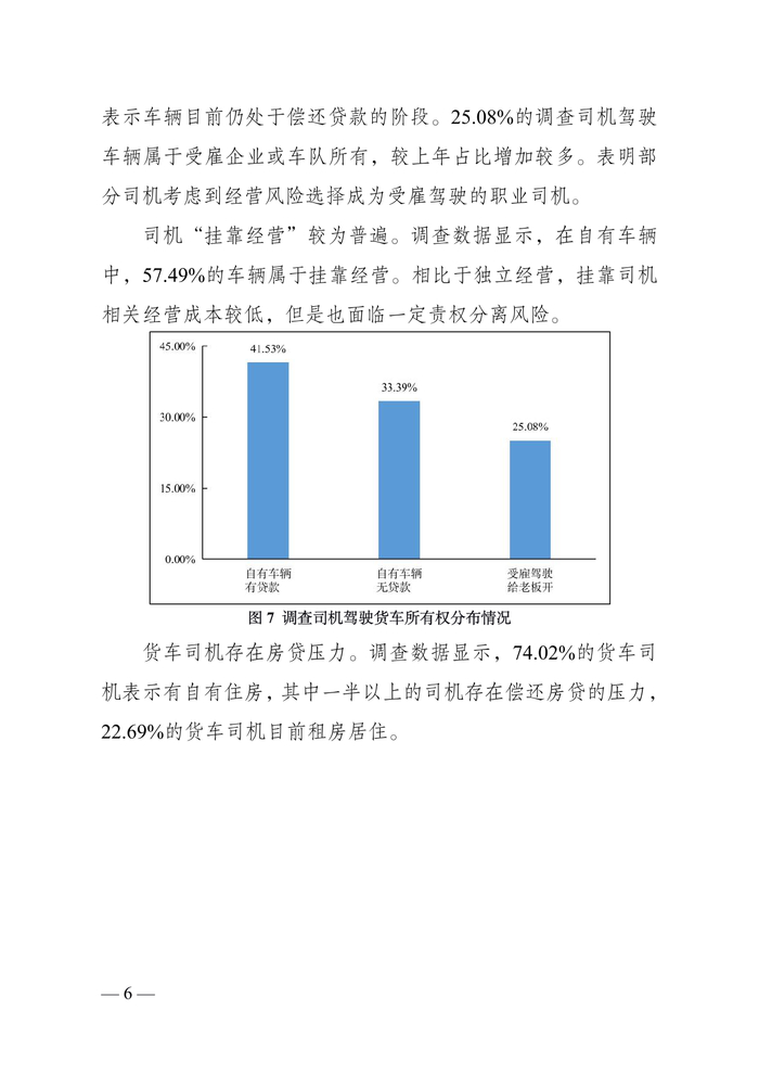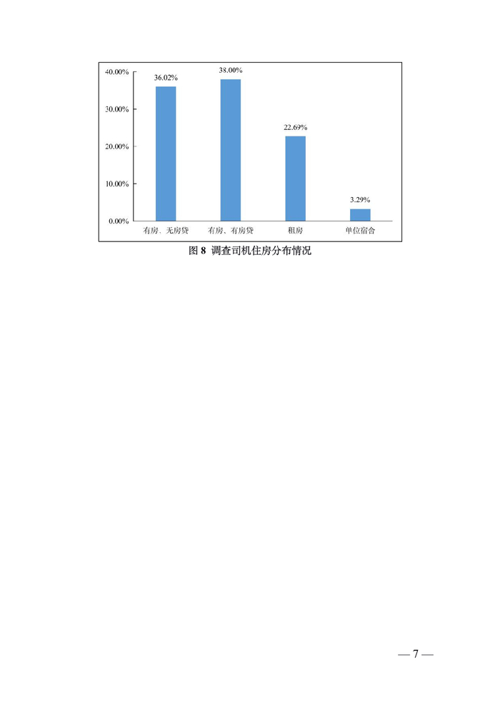 货车司机中“老司机”占比较为稳定。调查数据显示,从事道路货运 5 年以上的货车司机占比为 79.01%;10 年以上的占 比为 58.11%;15 年以上的 35.95%;20 年以上的 19.23%。“老 司机”仍然是主要就业群体。同时,调查显示,从事道路货运 5 年以下的司机占比为 20.98%,较上年调查有所增加,一批“新 手”涌入市场。