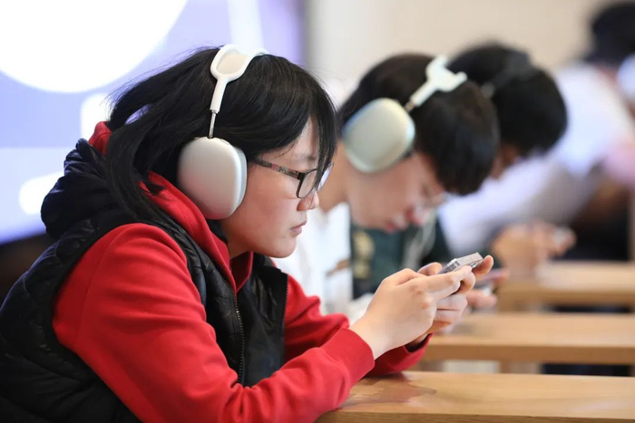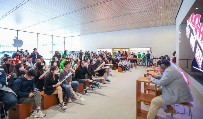 4月22日,在社友们观看电影附近的三里屯 Apple Store 零售店里,我们还看到了有众多玩家和观众一起参与了一场线下的游戏表演赛,据了解,其中还不乏《灌篮高手 正版授权手游》里的明星玩家。