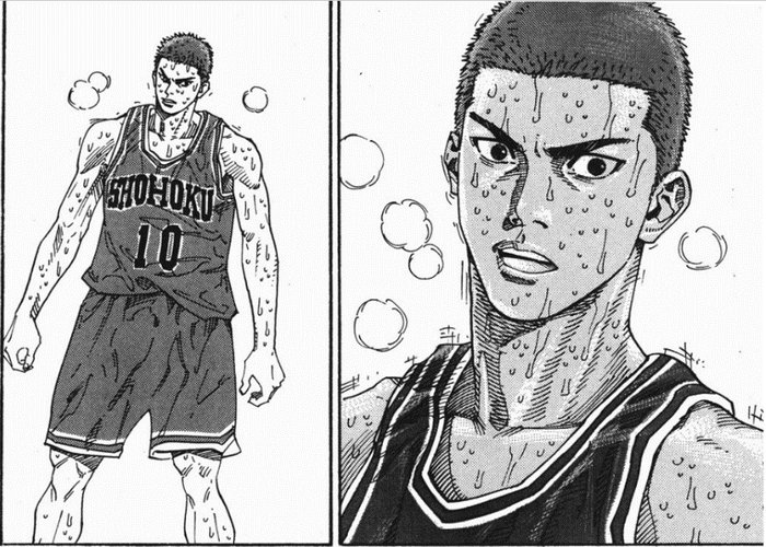 比赛途中,运动员会体温升高,汗珠密布,会分泌乳酸,疲惫到抬不起手。这样的刻画在《灌篮高手》以前的运动漫画中不曾出现,在《灌篮高手》之后蔚然成风。