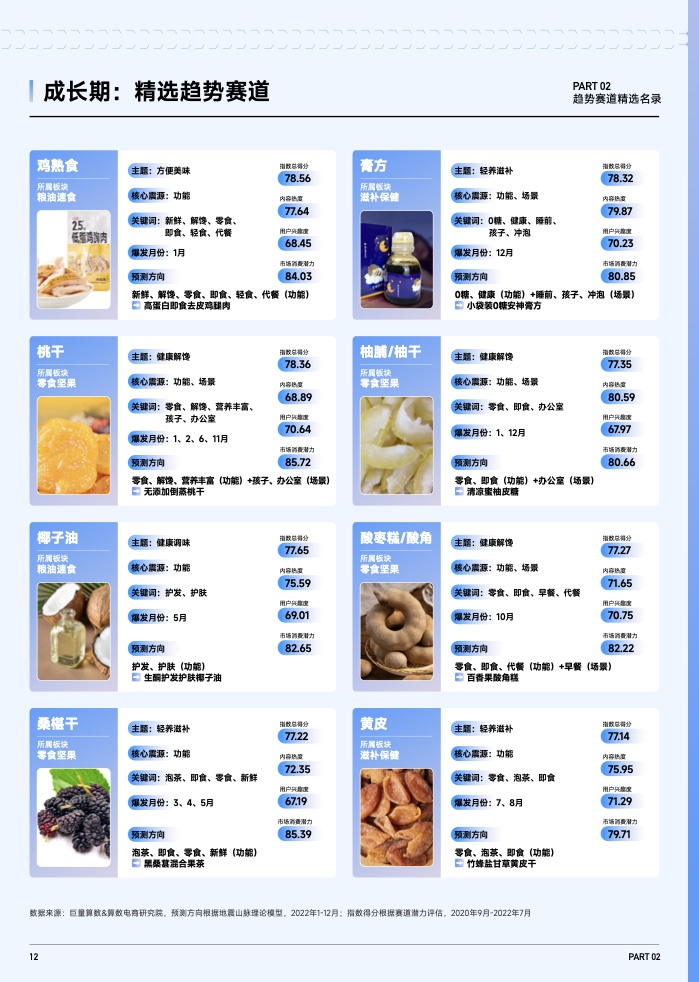 本期「赛道名片」食品饮料行业专刊,巨量算数&算数电商研究院通过模型能力精选了40个食品饮料行业潜力类目,总结了轻养滋补、健康解馋、方便美味、新鲜饱腹、健康调味、品质生活6个主题,也发现了食品饮料行业在产品创新、地方风味等方向的趋势信号。希望通过此次面向食品饮料行业的趋势赛道挖掘、趋势风向解读与预测,助力品牌和商家把握抖音新机遇、打开行业新局面。