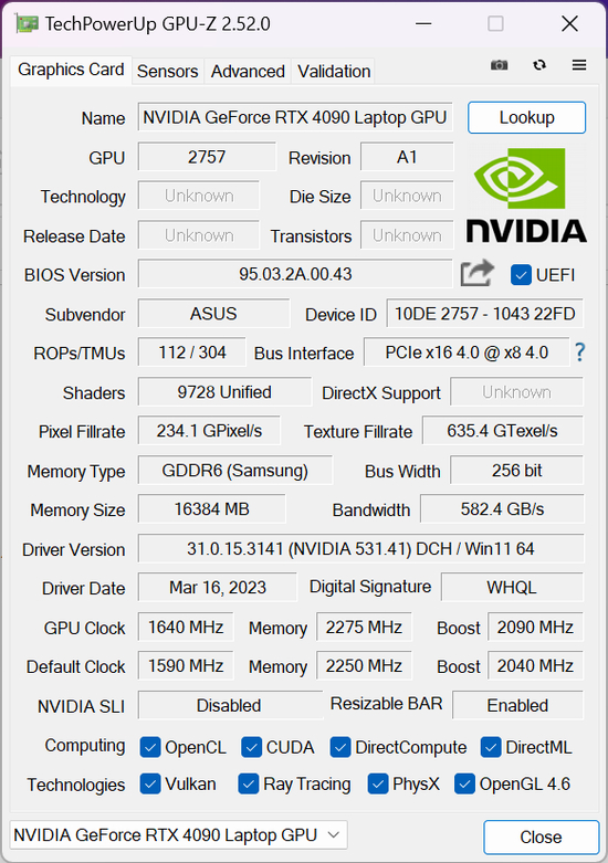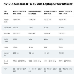 从规格来看,RTX 4090移动版无疑是今年移动平台的旗舰产品,有着9728个CUDA核心,核心频率1640MHz,Boost频率2090MHz,显存为16GB GDDR6,显存位宽256bit,显存频率2275MHz。