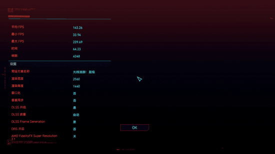 在RTX 4090的测试中,《赛博朋克2077》的画质设置为:2560×1440、光线追踪:超级、开启DLSS Frame Generation,运行Benchmark得到平均143.26帧的成绩。该成绩还是相当给力的,在2K最高光追画质下可以非常流畅的体验赛博朋克的世界。