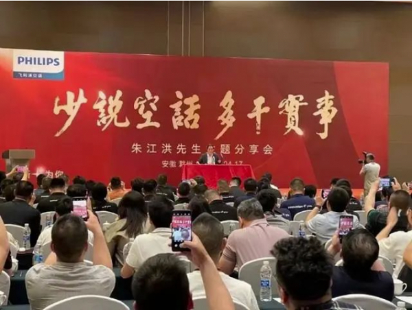 安徽滁州,飞利浦空调的产研基地,一块带着飞利浦logo的红色幕布上印着“少说空话,多干实事”八个大字,已经78岁的朱江洪就坐在幕布前,向参会的人们侃侃而谈。他分享了自己的企业经营管理之道,称赞飞利浦空调的工艺、技术、品质,也谈及到了格力当年的质量管理。得一提的是,这期间朱江洪还重磅发声:“(飞利浦空调)坚持品质创新和传承渠道发展模式,必须让广大经销商挣到钱,挣更多的钱!”