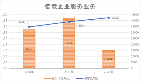 2022年末,智慧企业服务付费客户数达42339位,同比增长8.72%,收入为1.4亿元,同比下降16.13%,留存率为52.1%,减少了21.3个百分点。