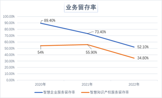 同期,智慧知识产权服务数为23088位,同比下降34.12%,收入为8120万元,同比下降44.91%,留存率从2021年的55.9%,下降到34.8%。