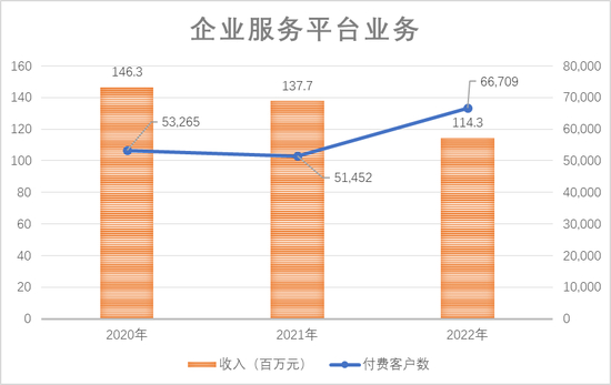 2020-2022年,企业服务平台业务的付费客户数量逐年增多,分别为53265、51452和66709人。