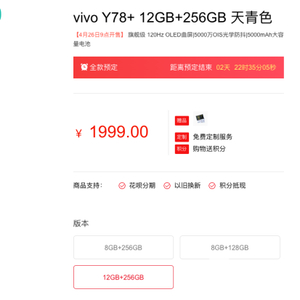 价格方面,vivo Y78+有三个版本,8GB+128GB售价1599元;8GB+256GB售价1799元;12GB+256GB售价1999元。配色方面,vivo Y78+有三个配色,分别为天青色、月影黑、暖阳金。