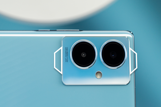 矩形的摄像头模组与双圆环镜头搭配一起,凸显出设计上的简约大方。摄像头在两个圆环中一字排开,闪光灯在镜头中间恰好构成了一个人脸,像一个可爱的小机器人,提高了不少辨识度。