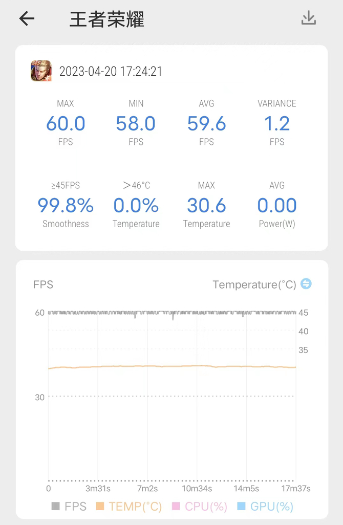 vivo Y78+搭载了台积电6nm工艺的骁龙695,我们在游戏中进行实测,看看它的实际表现如何。由于王者还没适配高帧率,在60帧+高清画质下,平均帧率59.6帧,全程帧率几乎是一条直线。在长时间的游戏过程中,也没出现明显的帧率波动,游戏内的画面也非常流畅,机身最 高温度约32度,一点也不烫手。