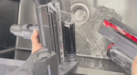 下面整个配件又能直接水洗(标重点:这款产品用上了戴森首个防水马达),且污水箱和清水箱是一体的,不像传统洗地机需要分开清洗,加上可以轻松拆卸的结构,一开一抽,没留死角,冲就完事了,一分钟搞定。