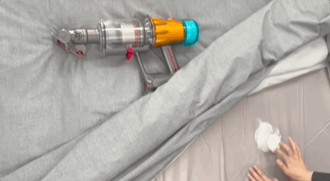 现场倒痱子粉在床上,再把厚被子盖上去,从被子表面推几下,再掀开被子,痱子粉已经几乎没了,这种「魂穿」能力看得出戴森搞深度清洁还是有点东西的。