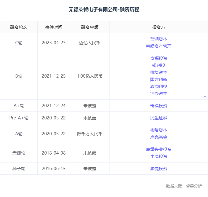 成立至今,莱顿电子已完成7轮融资,引入了包括蓝湖资本、彬复资本、奇福投资、民生股权基金、源悦投资国方创新等机构投资者。