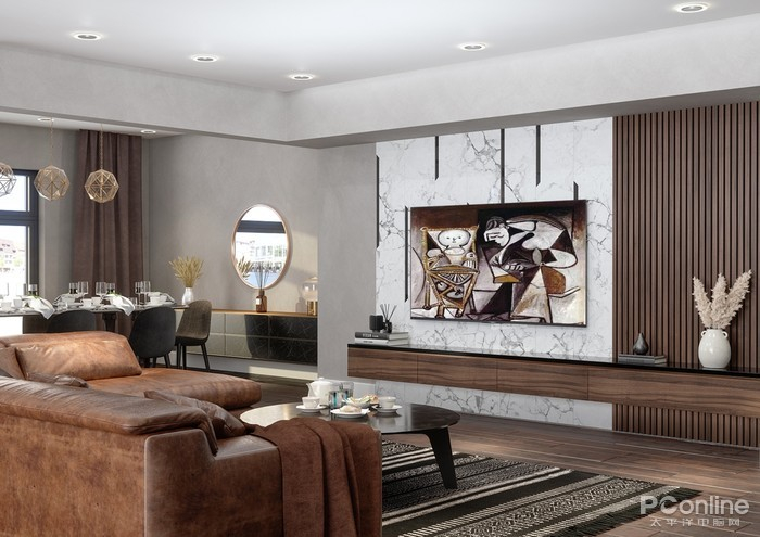 挂装电视可以令客厅空间更大、更灵活、更简洁美观,但大多数电视挂装后,会略显“厚重”地凸出于墙面。为解决这种厚重与凸出带来的不美观,消费者不得不煞费苦心地打造一面既能点亮家装风格、又能与电视外观和尺寸相匹配的电视墙。这种做法既增加装修预算,也局限了客厅空间的可能性。难道就不能有一款可以轻松上墙、怎么装都好看的电视吗?