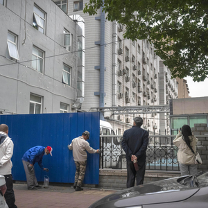 ↑4月20日,工人在北京长峰医院周围设置金属路障 据视觉中国