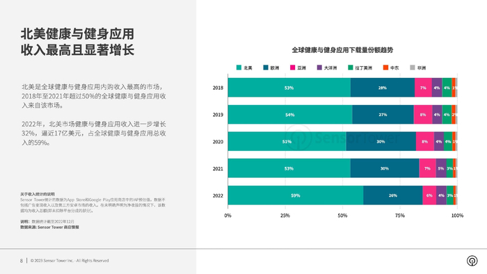 过去数年,北美一直是全球健康与健身应用收入最高的市场,2022年增长32%,逼近17亿美元,在全球同类应用的收入占比从2021年的53%提升至59%。