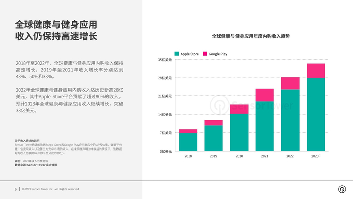 近年来全球健康与健身应用内购收入持续攀升,2019年至2021年分别实现43%、50%和33%的增长。2022年这一品类全球内购收入突破28亿美元,创历史新高,预计2023年全球健康与健身应用收入将超过33亿美元。