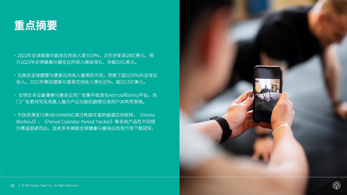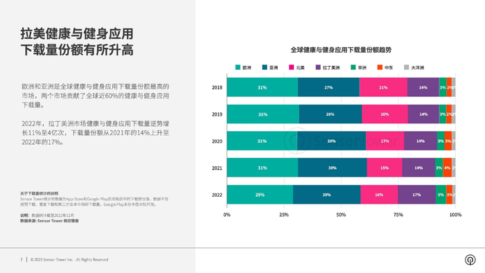 2022年,拉丁美洲、东南亚和中国台港澳市场健康与健身应用收入增长同样显著,增长率分别达到22%、16%和18%。