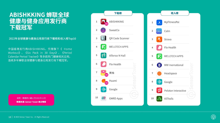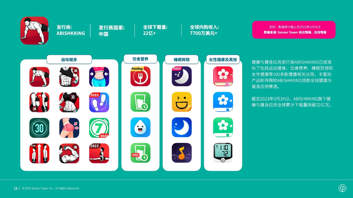 中国香港发行商ABISHKKING,凭借旗下《 Home Workout》、《Six Pack in 30 Days》、《Period Calendar Period Tracker》等多款热门应用,连续多年蝉联全球健康与健身应用发行商下载榜冠军。