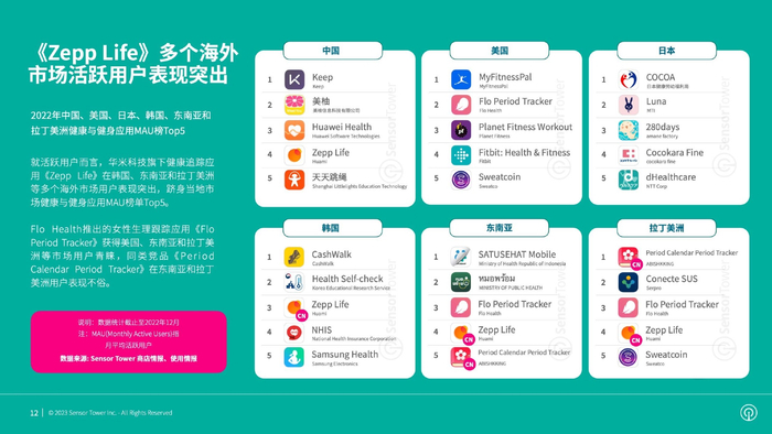 华米科技旗下健康追踪应用《Zepp Life》在韩国、东南亚和拉丁美洲等多个海外市场表现突出,跻身当地健康与健身应用月活跃用户(MAU)榜单Top5。