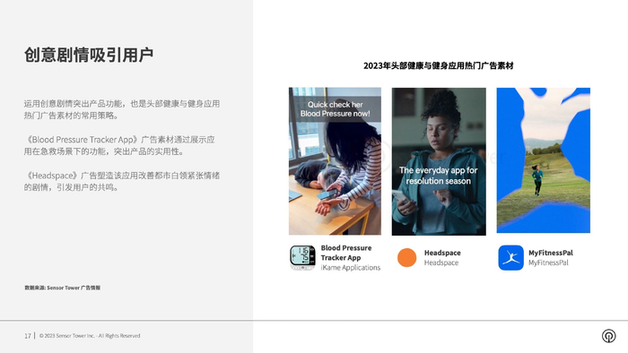 运用创意剧情突出产品功能,也是头部健康与健身应用热门广告素材的常用策略。正念冥想应用《Headspace》广告通过该应用改善都市白领紧张情绪的剧情,引发用户的共鸣。