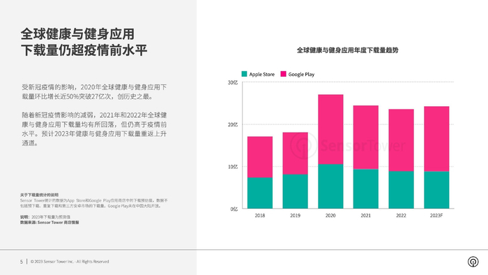 受新冠疫情的推动,2020年全球健康与健身应用下载量环比增长近50%,突破27亿次。尽管随着新冠疫情影响的减弱,过去两年全球下载量有所回落,但仍高于疫情前水平。