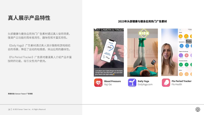头部健康与健身应用热门广告素材通过真人使用场景,强调产品功能的简单易用性、趣味性和丰富实用性。《Daily Yoga》广告素材通过真人演示锻炼和游戏相结合的场景,降低了运动的枯燥感,突出应用的趣味性。